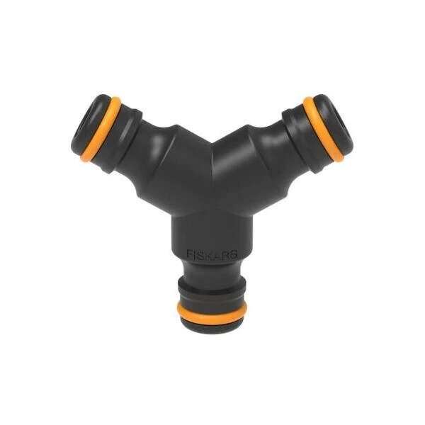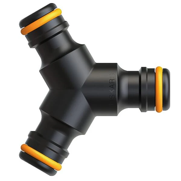 Om een waterbron aan te sluiten op twee verschillende tuinslangen of druppeldarmen met een willekeurige grootte kan je gebruik maken van deze slangkoppeling 3-weg van Fiskars.