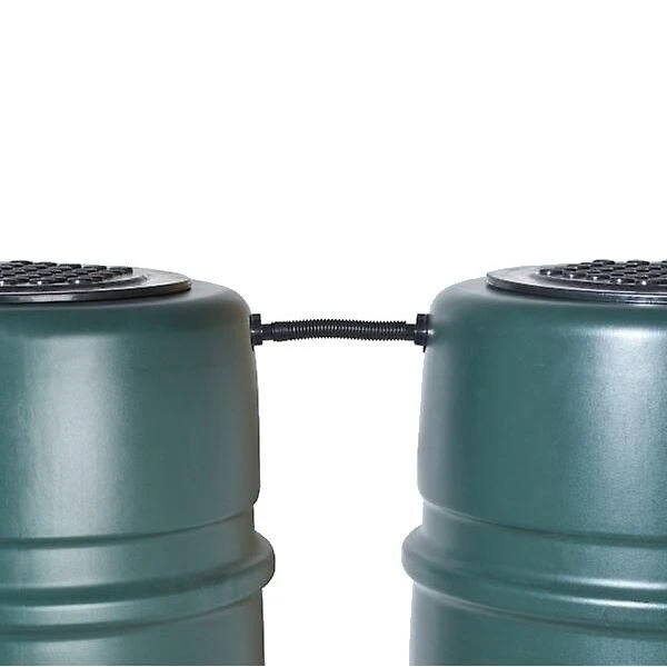 Verbindingsysteem voor nagenoeg alle kunststof regentonnen. Met dit eenvoudig systeem verbind je met gemak twee regentonnen zodat de ene ton in de andere overloopt als ze vol is (verbinding bovenaan).